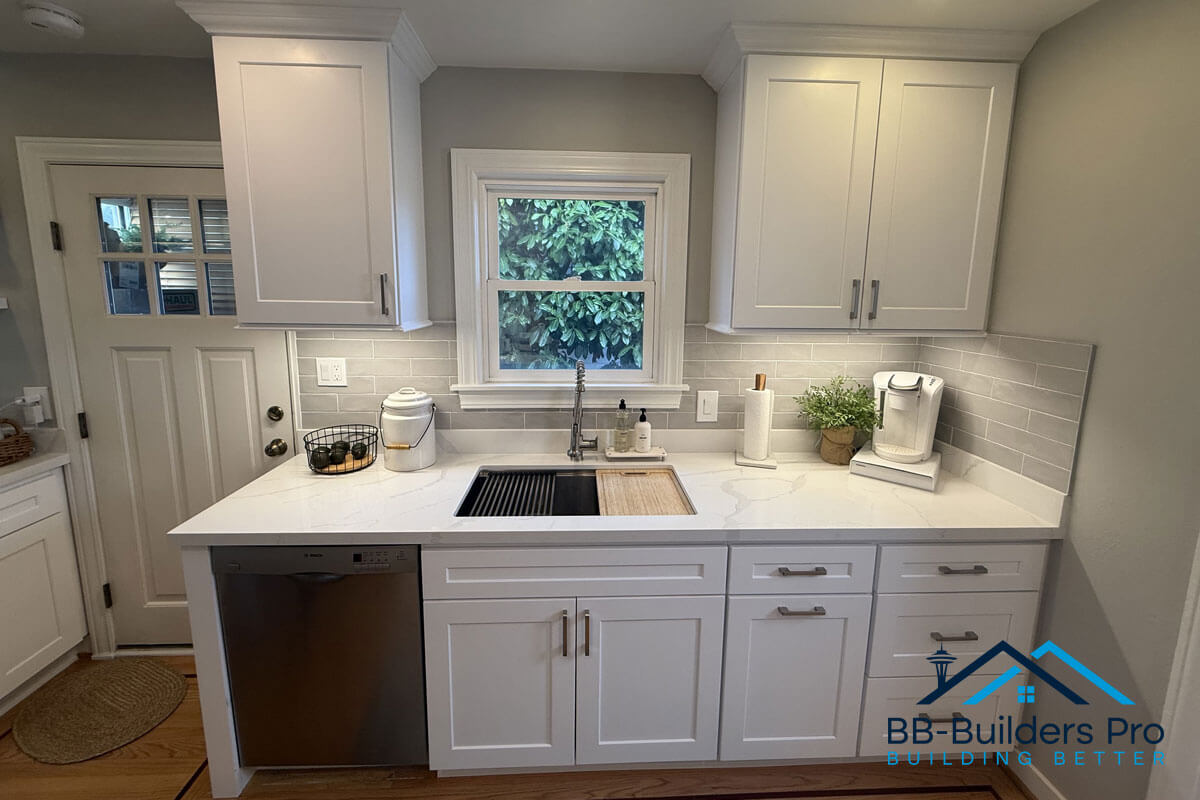 A complete kitchen transformation featuring custom cabinets, upgraded plumbing and electrical, and a quartz backsplash for a Seattle homeowner.