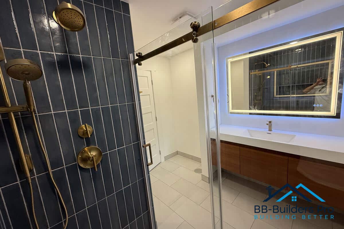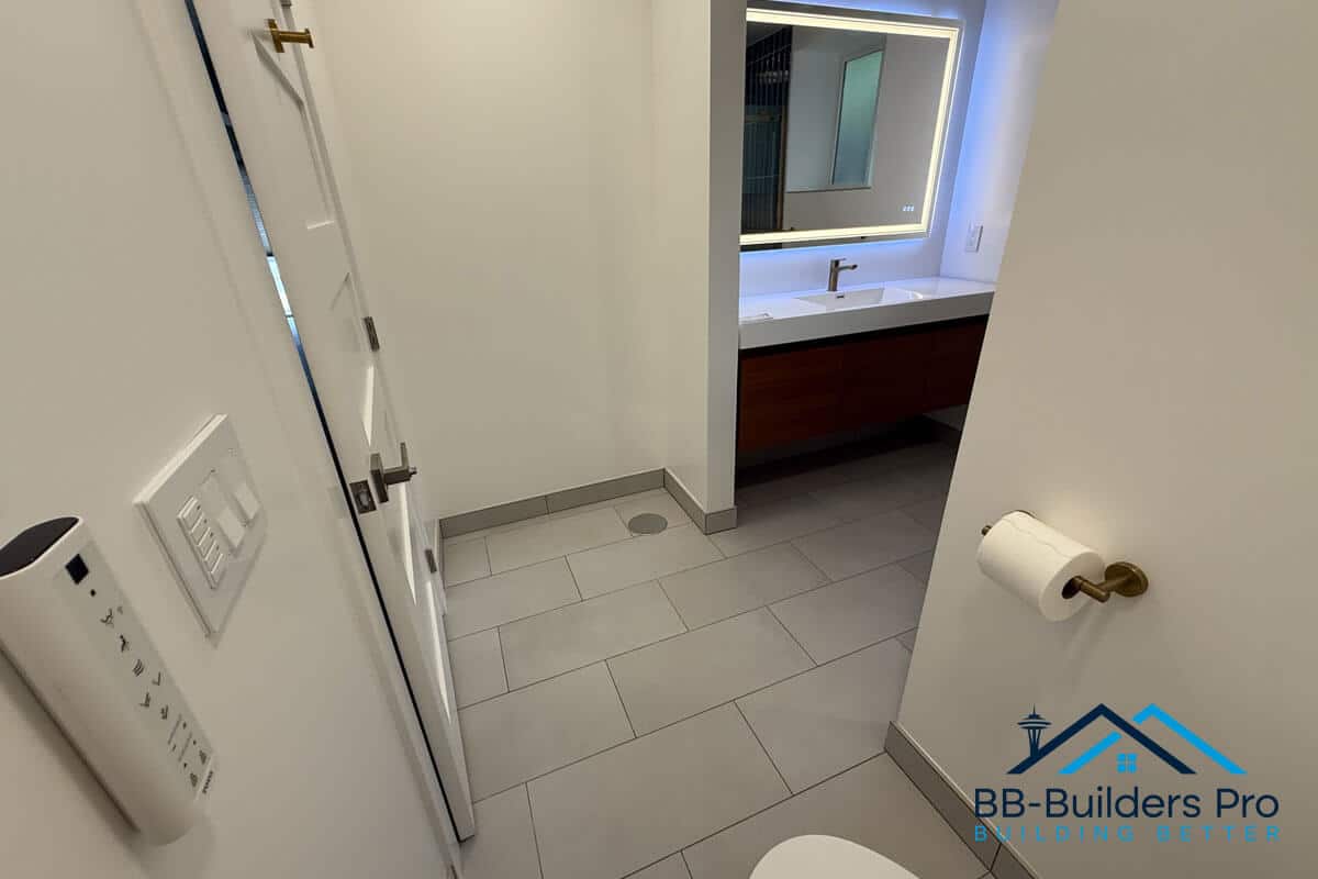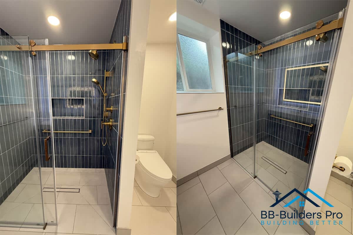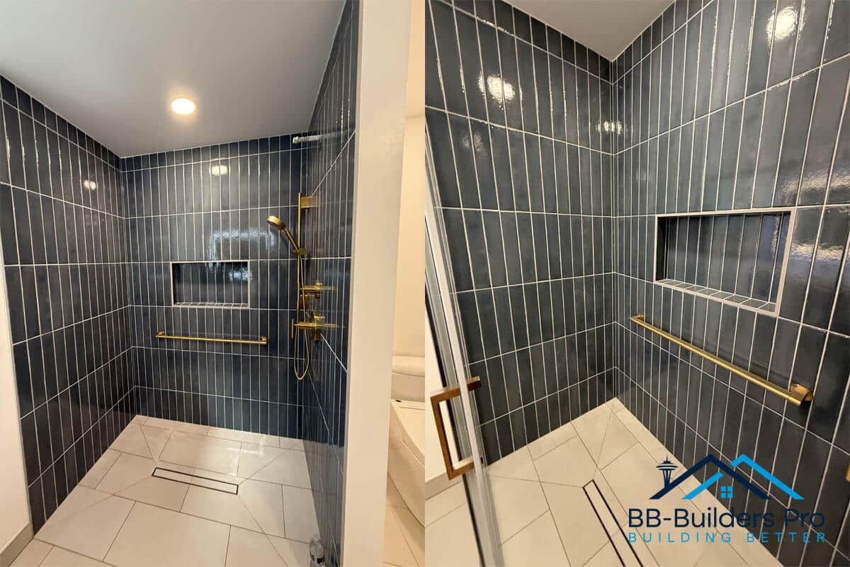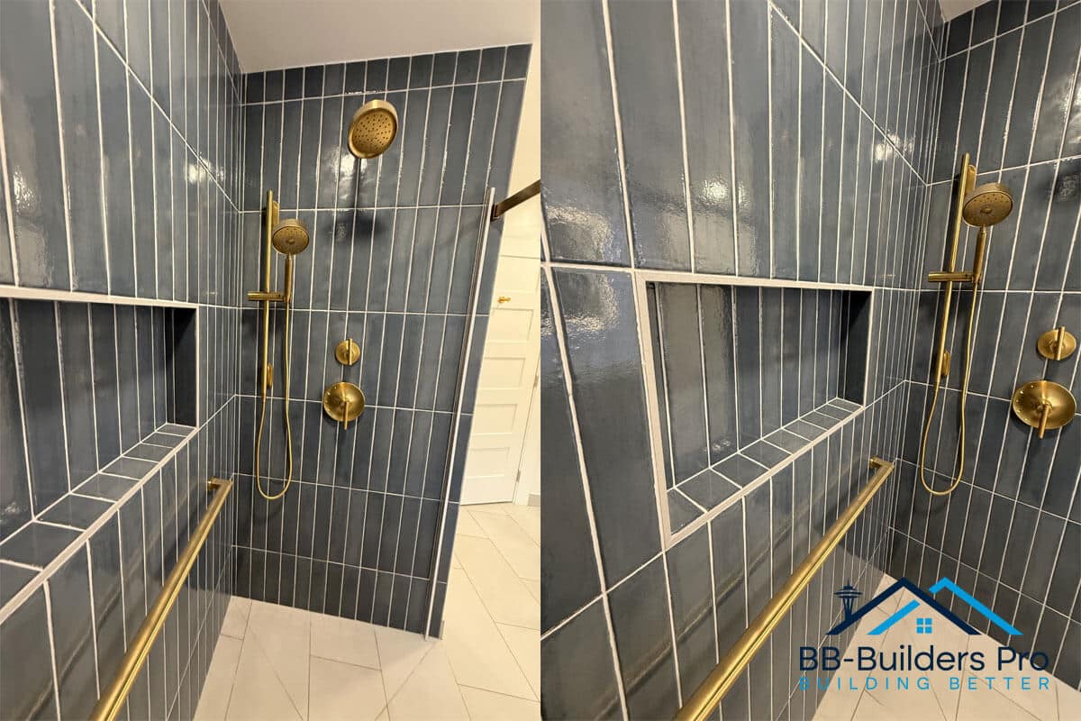 A fully customized bathroom renovation in Seattle featuring updated framing, slab plumbing, GROHE shower system, tile installation, and waterproofing.
